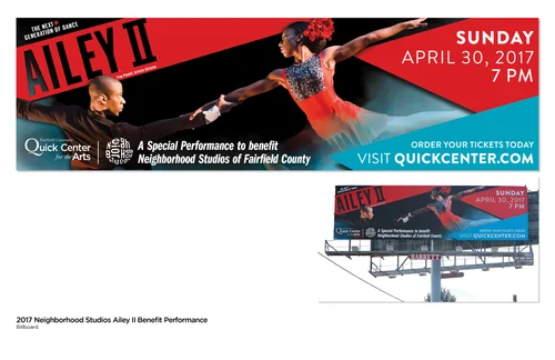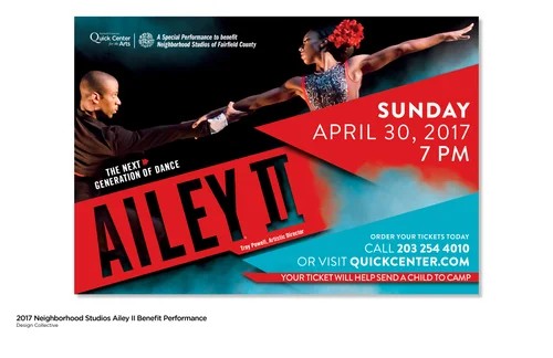 Design collateral for the 2017 Neighborhood Studios Ailey II Benefits Performance. Look created by me to drive attendance and participation in this benefit performance. Proceeds from this performance would help send children to summer camps involving the arts.